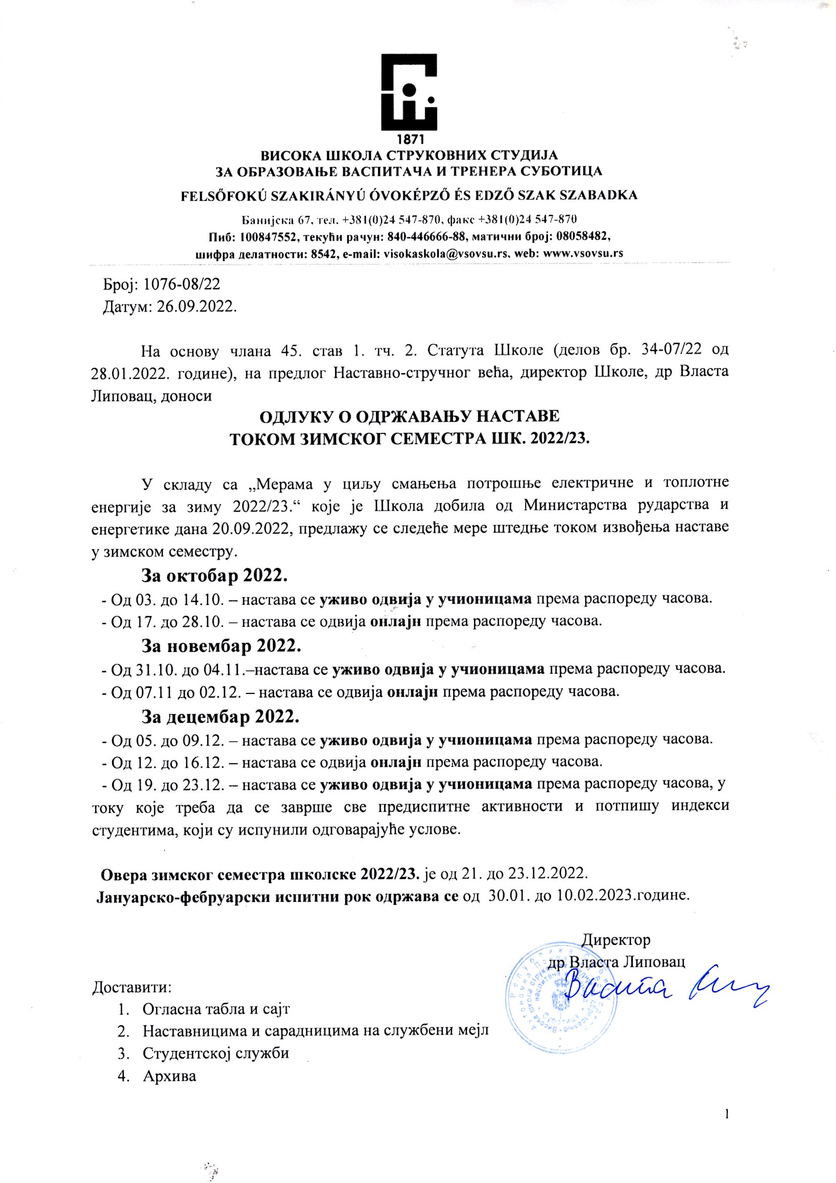 28.09.2022. 13:11 | ОДЛУКА О ОДРЖАВАЊУ НАСТАВЕ ТОКОМ ЗИМСКОГ СЕМЕСТРА ШК. 2022/23.