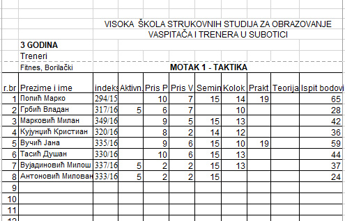 Поштовани студенти, Предиспитне обавезе и остварене бодове у склопу предмета можете видети у прилогу. Теоријски испит је заказан за 31.01. у 10 часова у учионици број 27., резултати испита ће бити истакнути у току дана, док ће се упис оцена у индексе обавити у петак, 01.02. од 10 часова у учионици 27. Предметни наставник