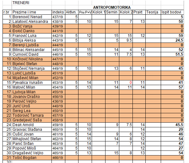 У прилогу су резултати колоквијума из Антропомоторике, као и број поена унутар предмета које сте до сада одрадили. Имајте у виду број поена остварених на колоквијуму од укупно 20 поена, те студенти, који нису остварили бар 10 поена, ће колоквијум морати поновити у јунском испитном року, пре изласка на испит.