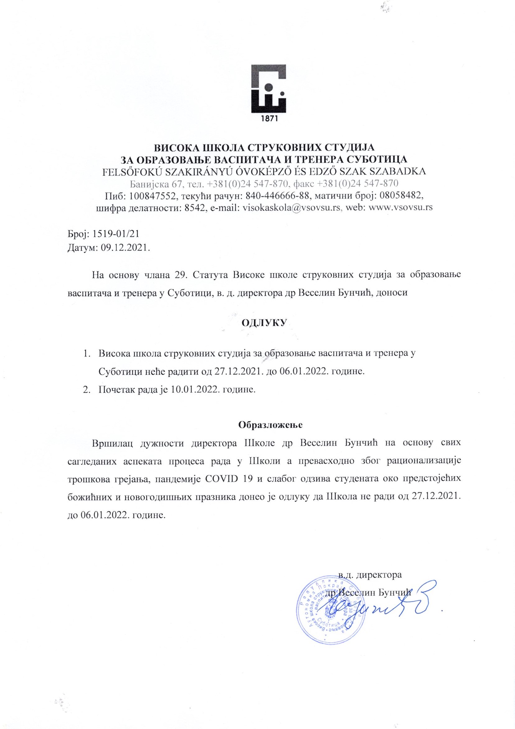Обавештавају се сви да Школа неће радити у периоду од 27.12.2021. до 06.01.2022. године.