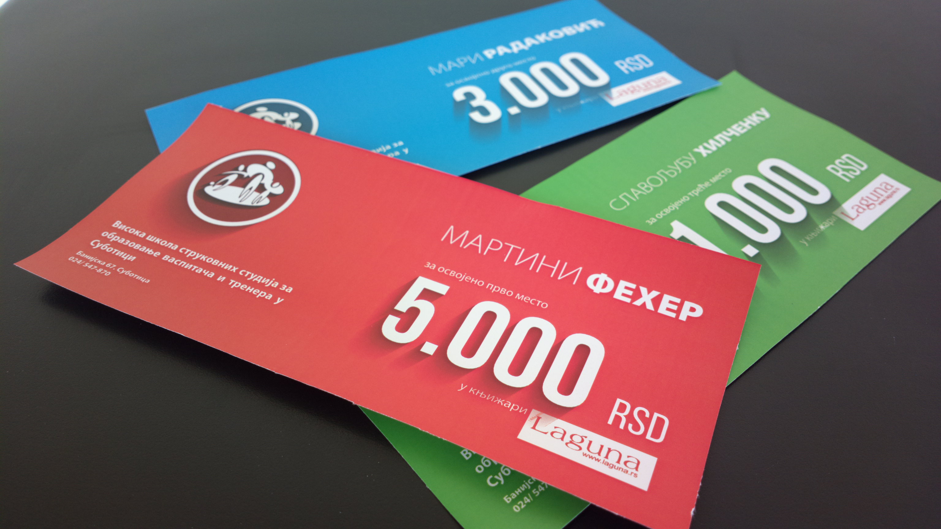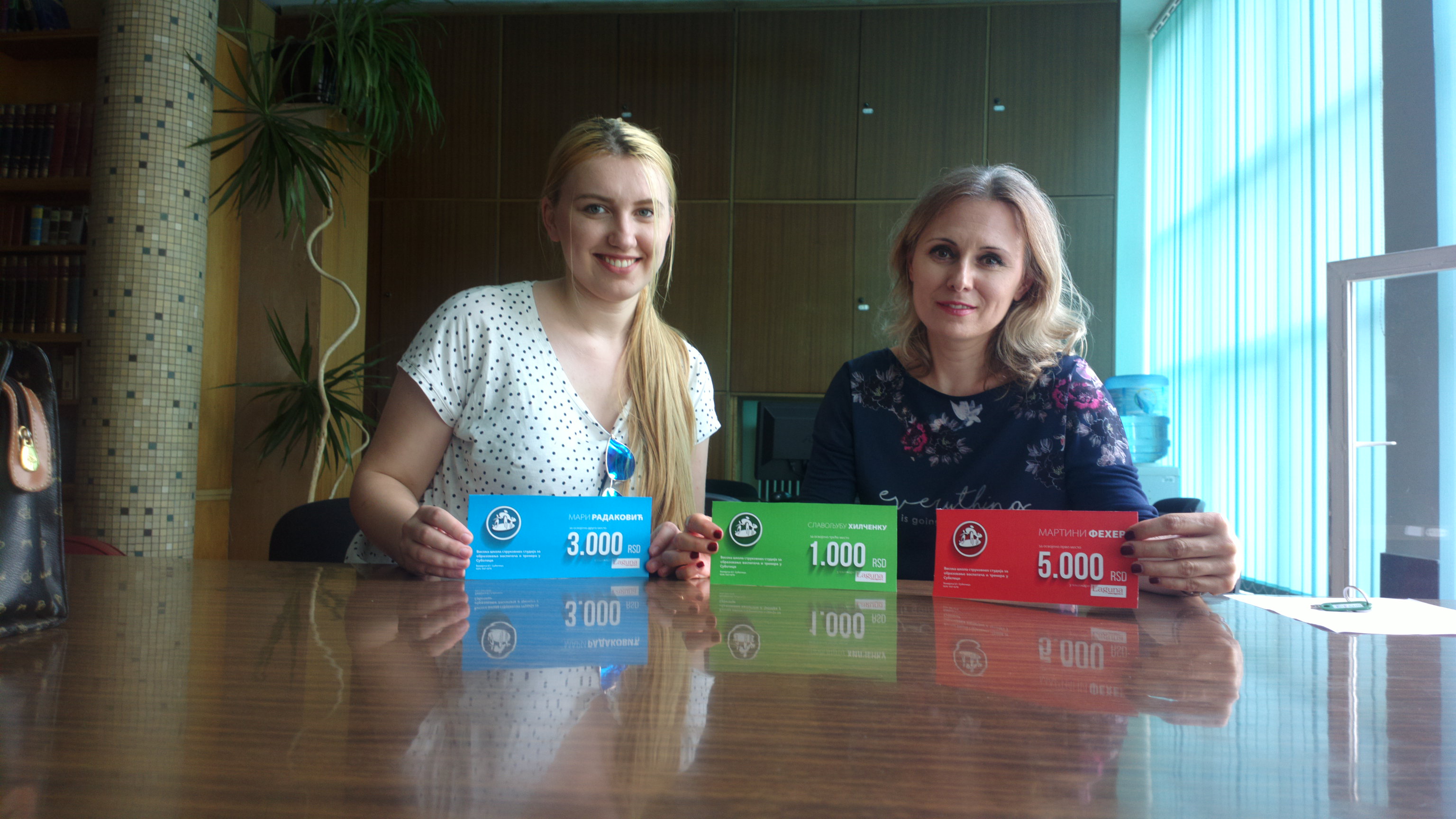 Поносни на наше студенте и учеснике конкурса за ираду логоа, уручили смо наградне ваучере за куповину књига у кљижарама Лагуна. Награде је у име школе уручила др Јасмина Кнежевић, а управа школе се још једном захваљује свима на учешћу и похваљује креативну иницијативу сојих студената. Да подсетимо, прво место је освојила студенткиња Мартина Фехер, док су друго и треће место заузели Мара Радаковић и професор Хилченко који је своју награду великодушно препустио учесници М. Радаковић.