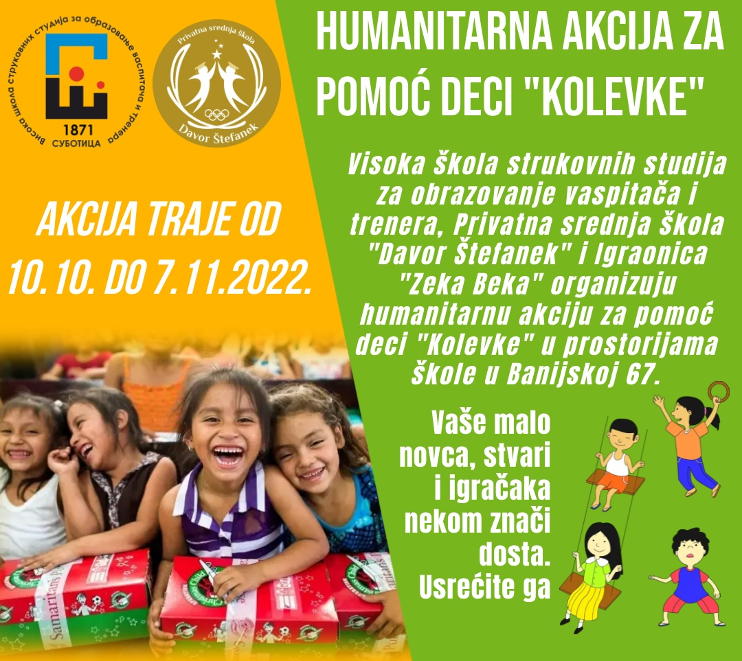 Наша Школа у сарадњи са Приватном средњом школом "Давор Штефанек" и Играоницом "Зека Бека" организује хуманитарну акцију за помоћ деци дома за децу ометену у развоју "Колевка". Акција ће се одржавати од 10.10.2022. до 07.11.2022. године у приземљу Школе и прикупљаће се средства, као и ствари и играчке и слично. Позивамо све да узму учешћа и дају свој хумани допринос. Ваше мало некоме значи много.