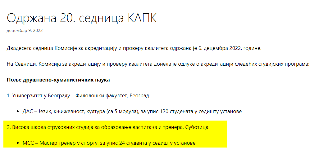 Обавештавамо да је успешно акредитован студијски програм мастер струковних студија под називом Мастер тренер у спорту