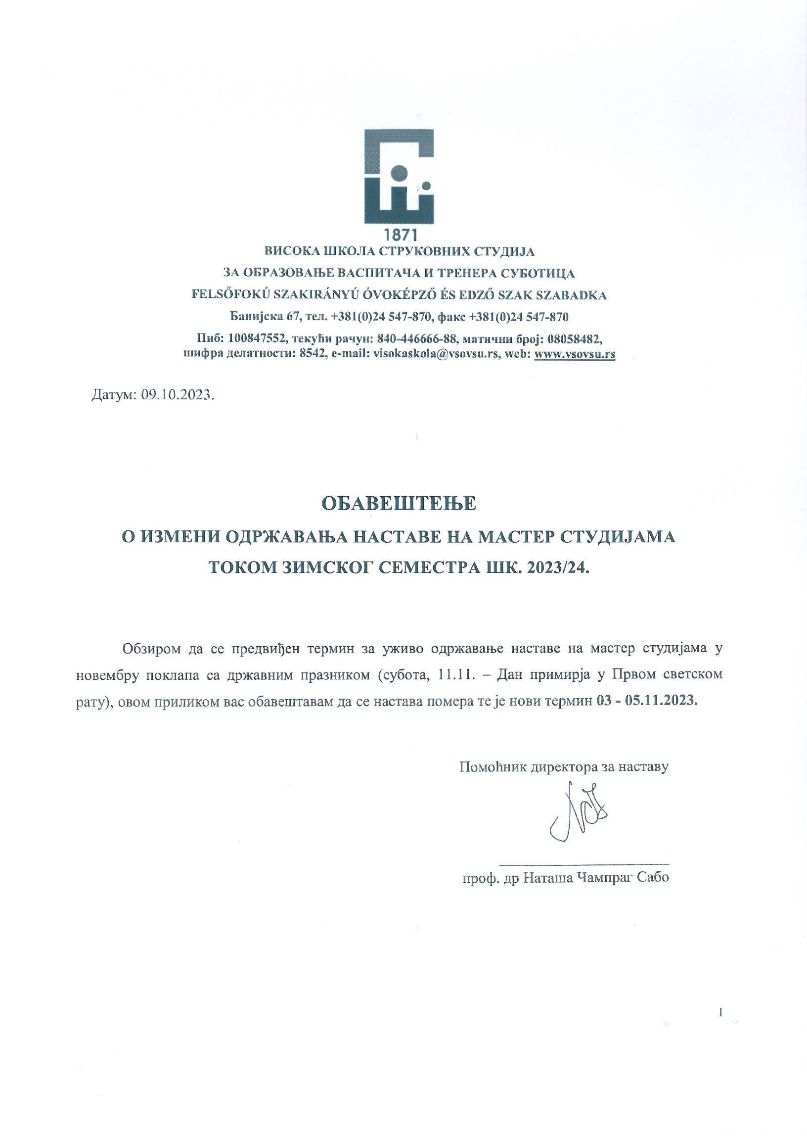 18.10.2023. 11:58 | ОБАВЕШТЕЊЕ О ИЗМЕНИ ОДРЖАВАЊА НАСТАВЕ НА МАСТЕР СТУДИЈАМА ТОКОМ ЗИМСКОГ СЕМЕСТРА ШК. 2023/24.